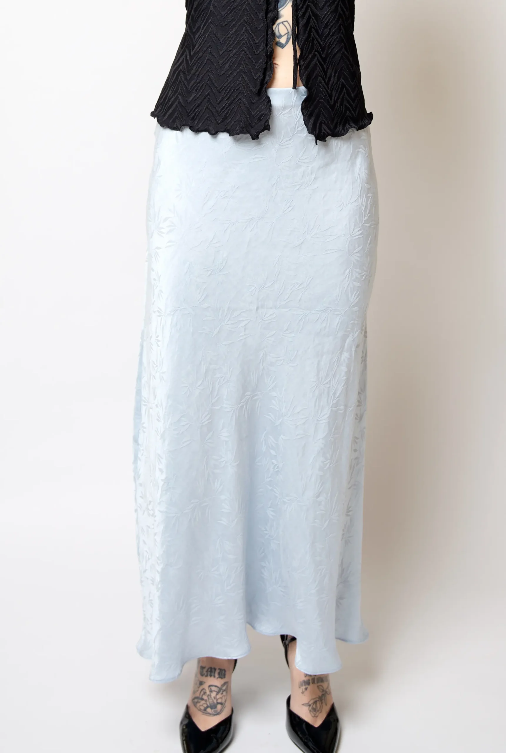 This skirt is made in soft white viscose fabric with black dots.